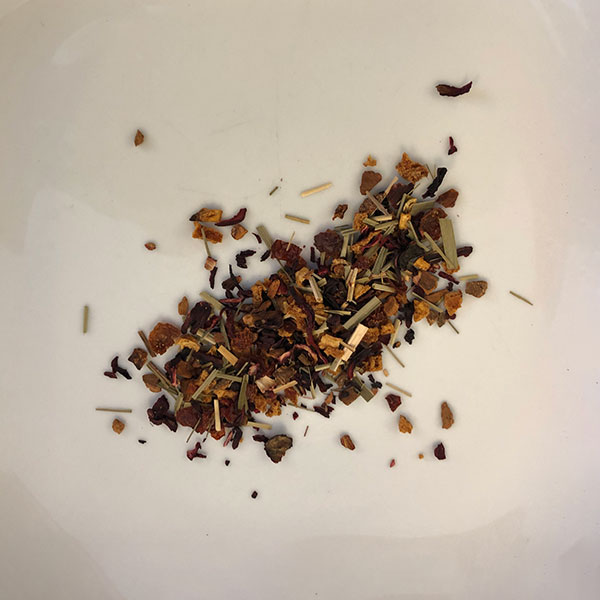 A blend of hibiscus, orange peel, cinnamon, rosehips, lemongrass, and passion fruit flavor. A best seller!
