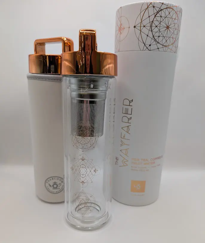A brew tumbler and travel flask for tea, coffee, and fruit water