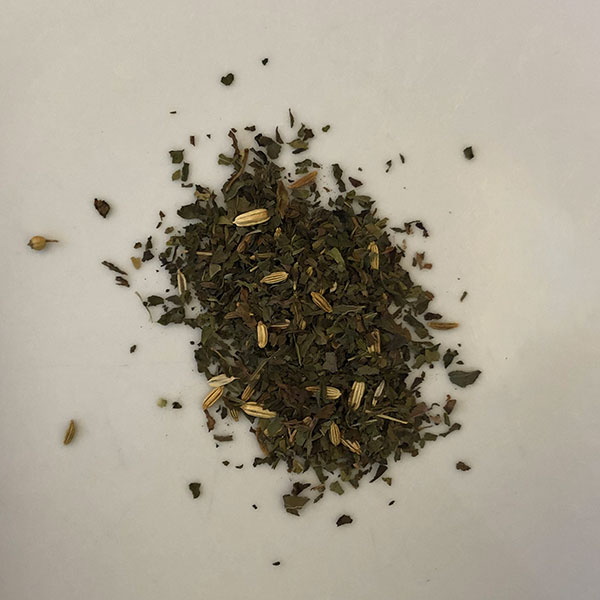 A blend of peppermint leaf and fennel seed, both used to soothe an upset stomach.