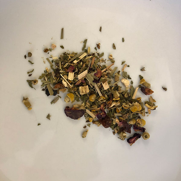 A blend of chamonmile, safflower, licorice root, ginger, fennel, rose, mint, rosehips, lemongrass, and holy basil.